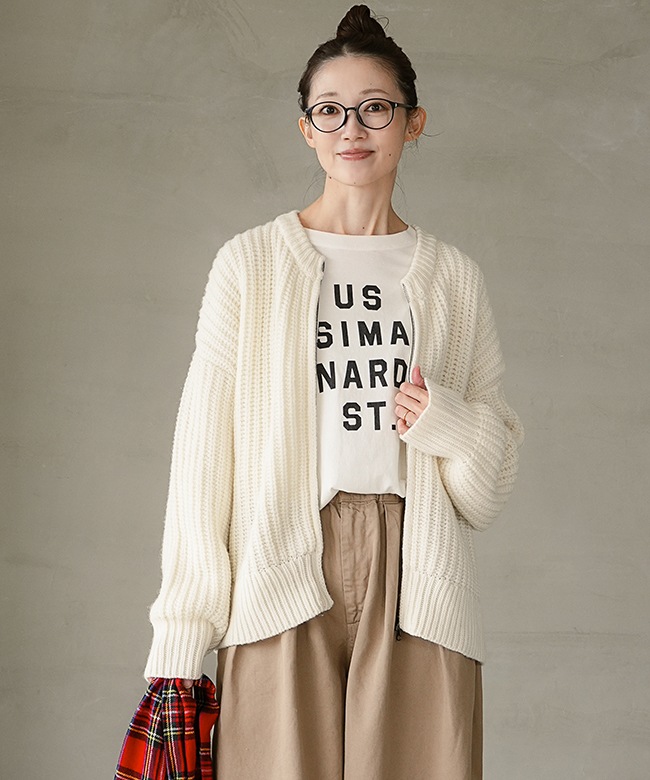 スエード調のやわらかな質感が、オフホワイトのあぜ編みニットと相性抜群◎