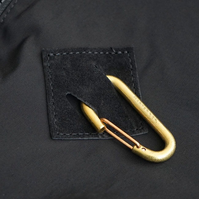 ・オリジナルロゴが刻印されたゴールドの真鍮カラビナがデザインのアクセントに。