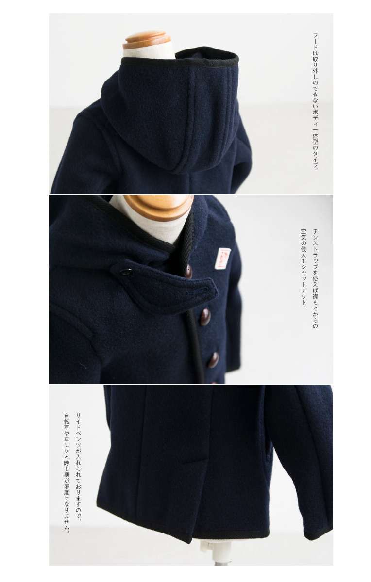 弾力のある柔らかなウールモッサ素材に、くるみボタン、同素材のフードなど、