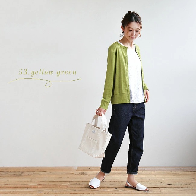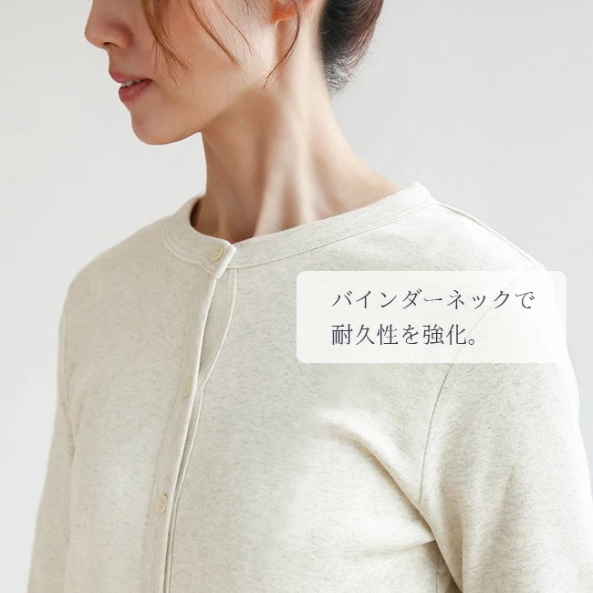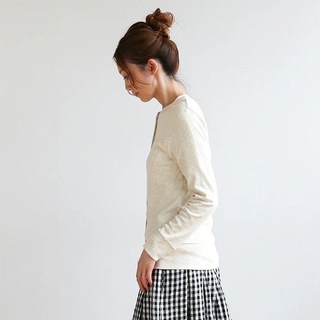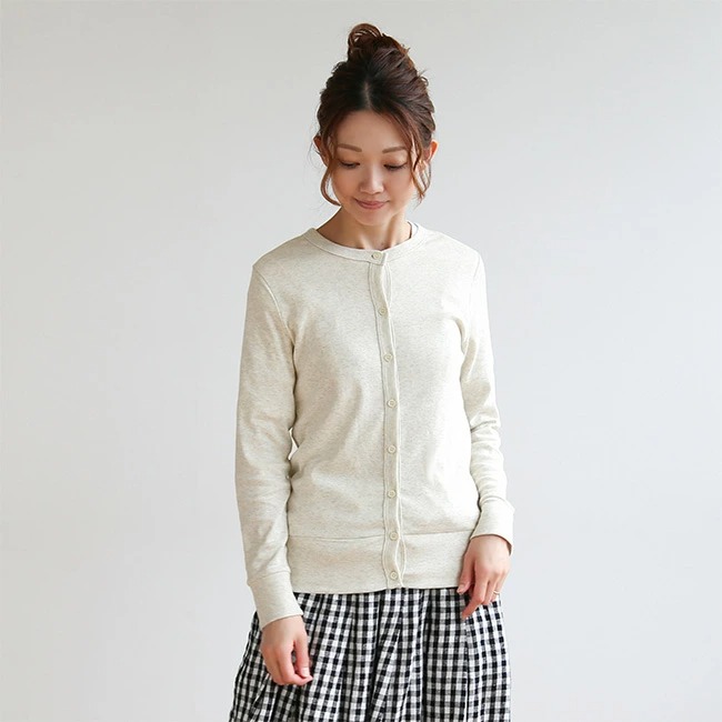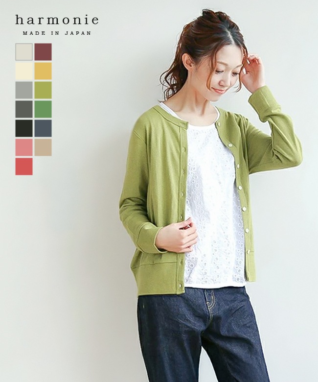 harmonie(アルモニ)から、ブランドの定番アイテムであるオーガニックコットンクルーネックカーディガンのご紹介です。