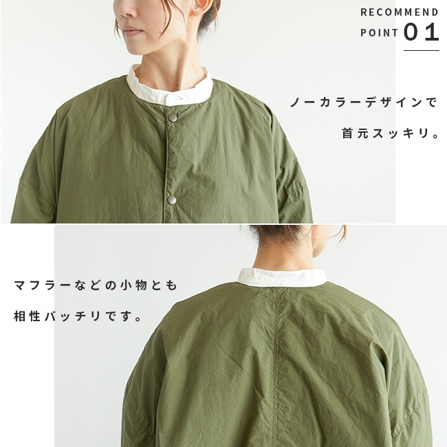 ・首元はフードや襟のないノーカラーで、タートルネックやパーカー、マフラーなどとも好相性。