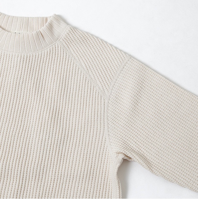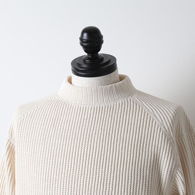 極太の糸を使用し独自の方法で編み立てたワッフル生地のミッドネックのセーター。