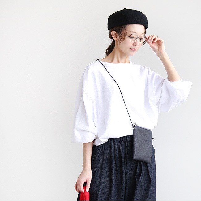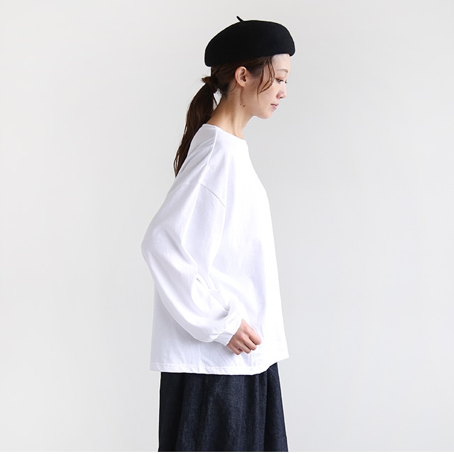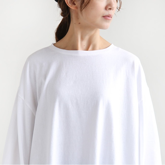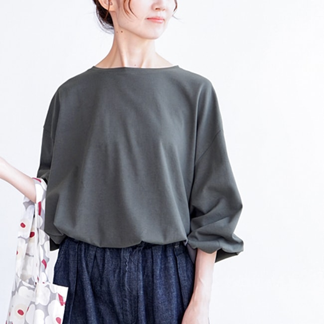 ラフなカットソーですがブラウスのようなシルエットで、一枚でもコーディネートに映えるデザインに仕上がりました。