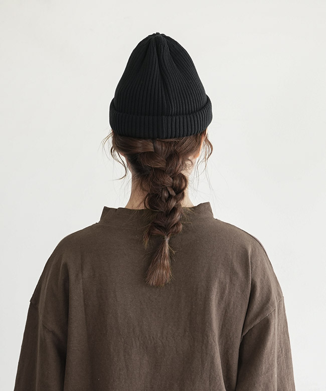 よく伸縮するリブ編みですので ヘアスタイルに合わせて深く被ったり浅く被ったりアレンジが可能です。