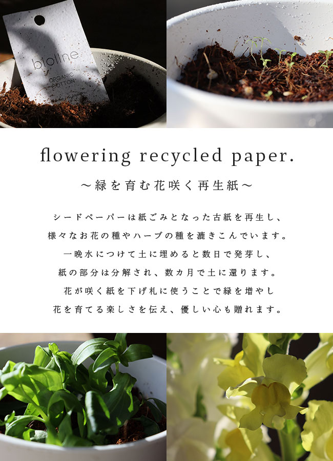 タグには普段廃棄される縫製くずを利用し、さまざまなお花の種やハーブの種が入ったリサイクルペーパー“シードペーパー”が使われています。