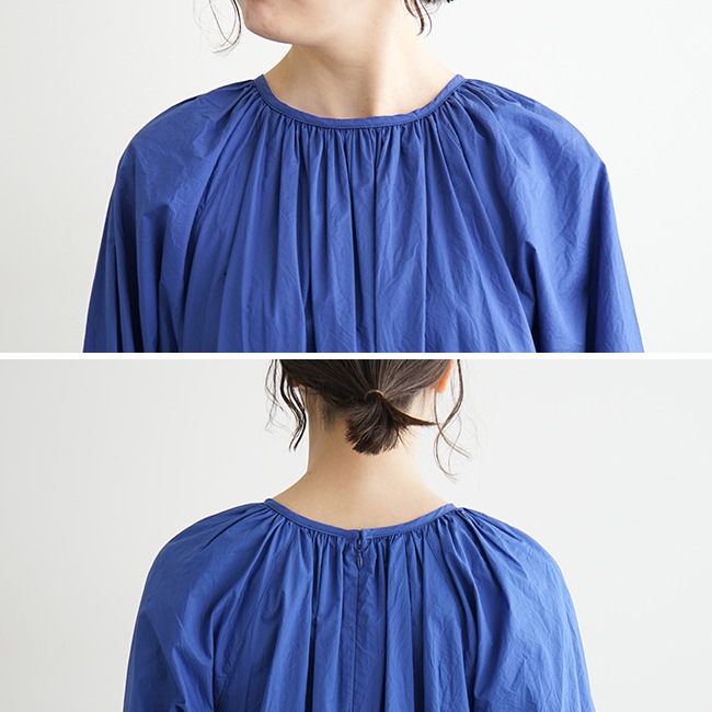 ・首元には無数のギャザーを入れ、デコルテラインが美しく見えるデザインに。