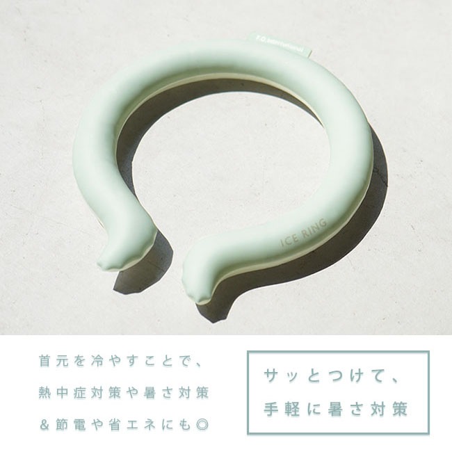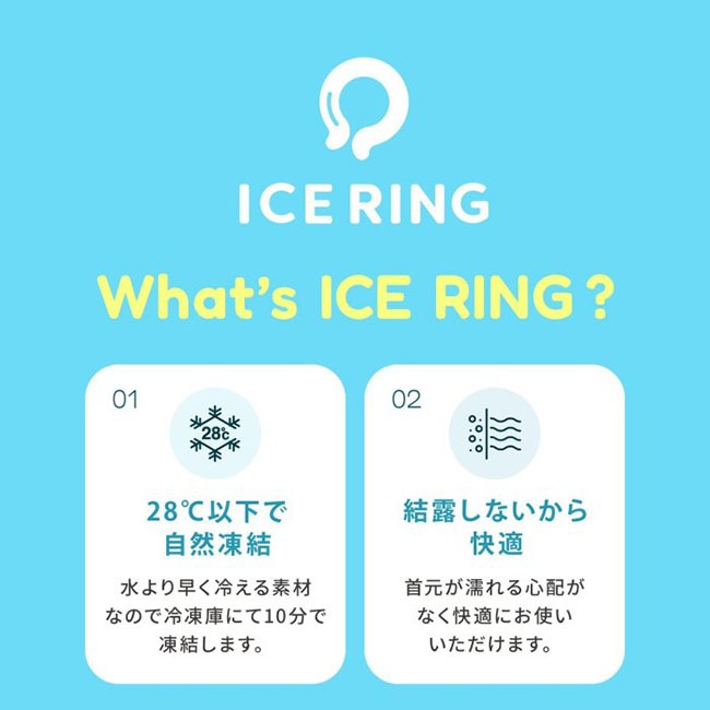 「ICERING アイスリング」は28℃以下で自然に凍結し、屋外屋内どこでも繰り返しお使いいただけるアイテム。