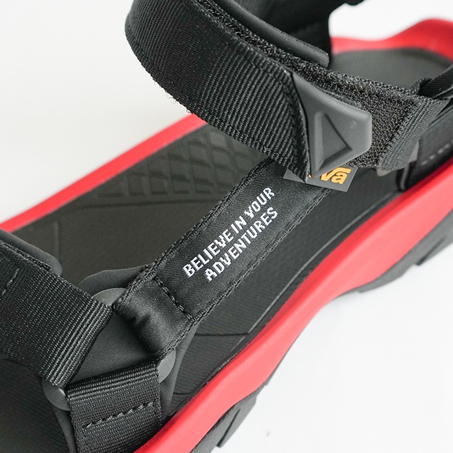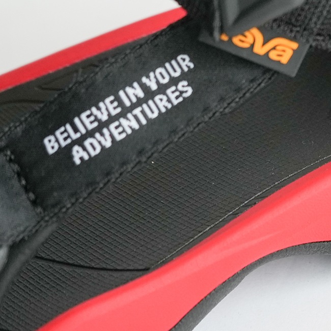 かかとのストラップにはNANGAのブランドロゴ、サイドのストラップにはNANGAのスローガン“BELIEVE IN YOUR ADVENTURES”を記したネームを配しています。