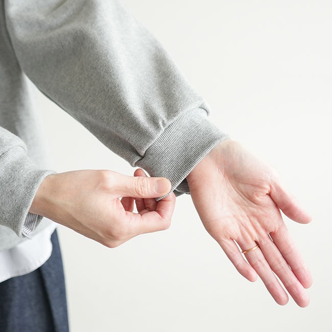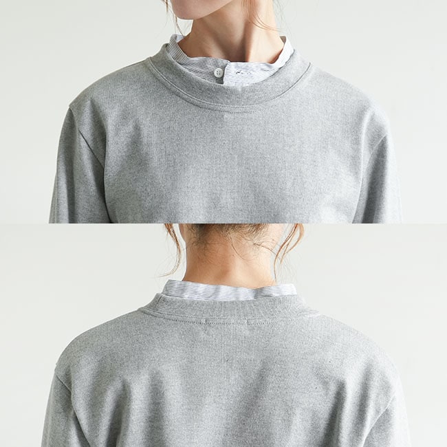 ・1枚で着てもサマになるよう、ネックや裾、袖口は太めのリブ。