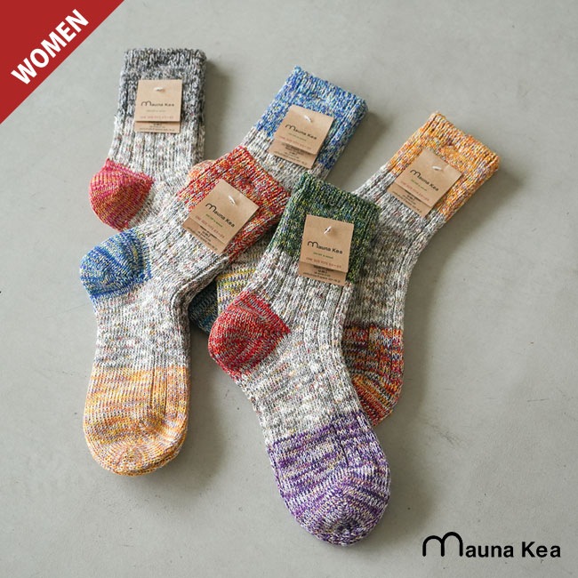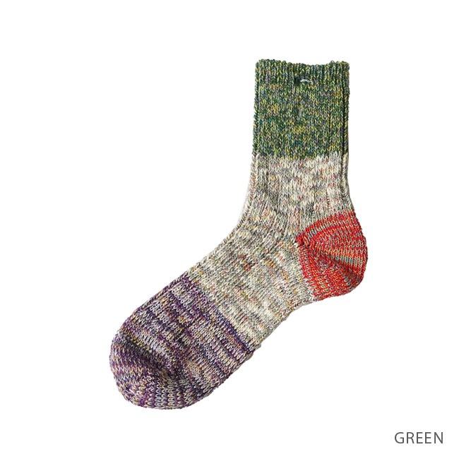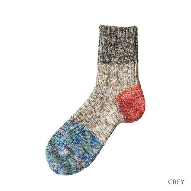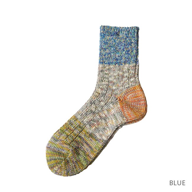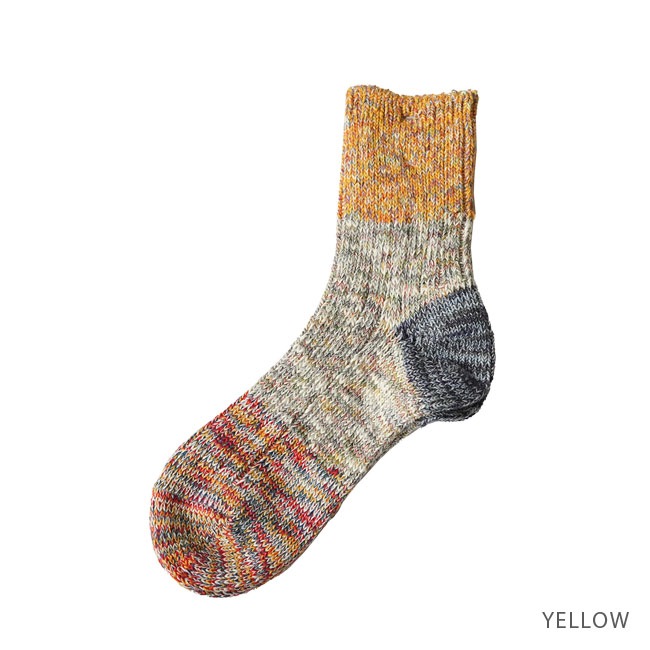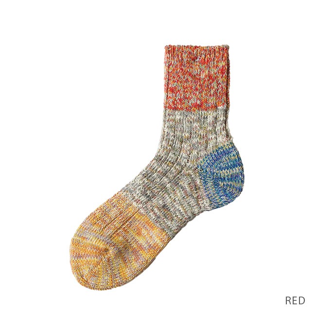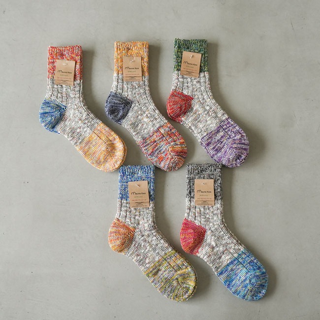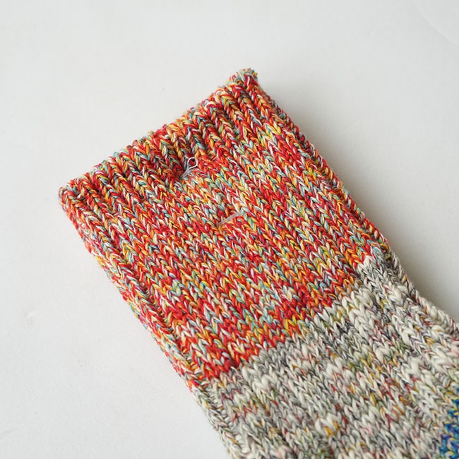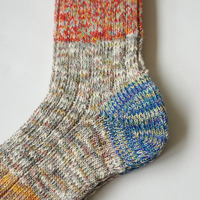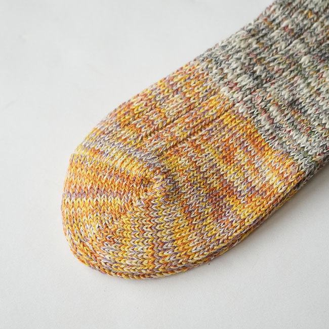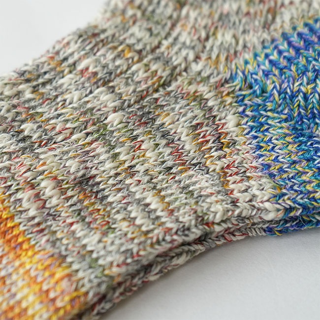 ・多彩な色糸とネップが不均一に混ざった杢糸を使用したミドル丈のソックス。