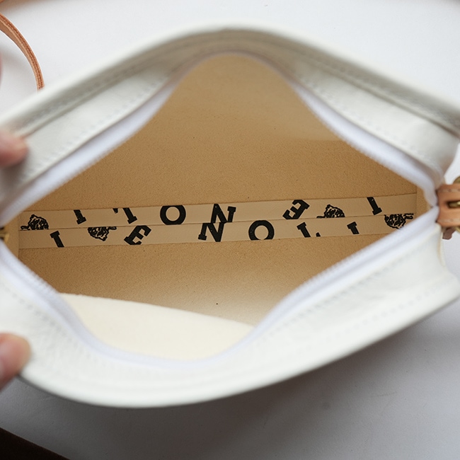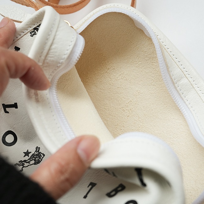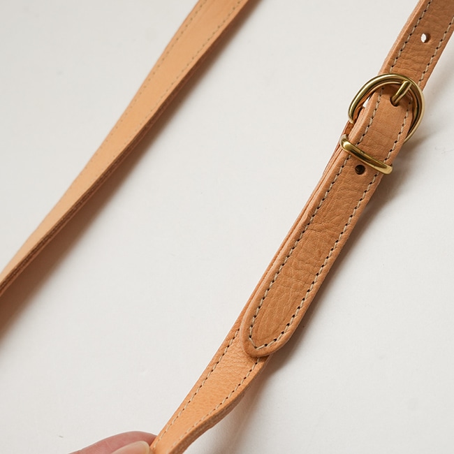 本体はシボ革、肩紐はヌメ革で長さ調節が可能。