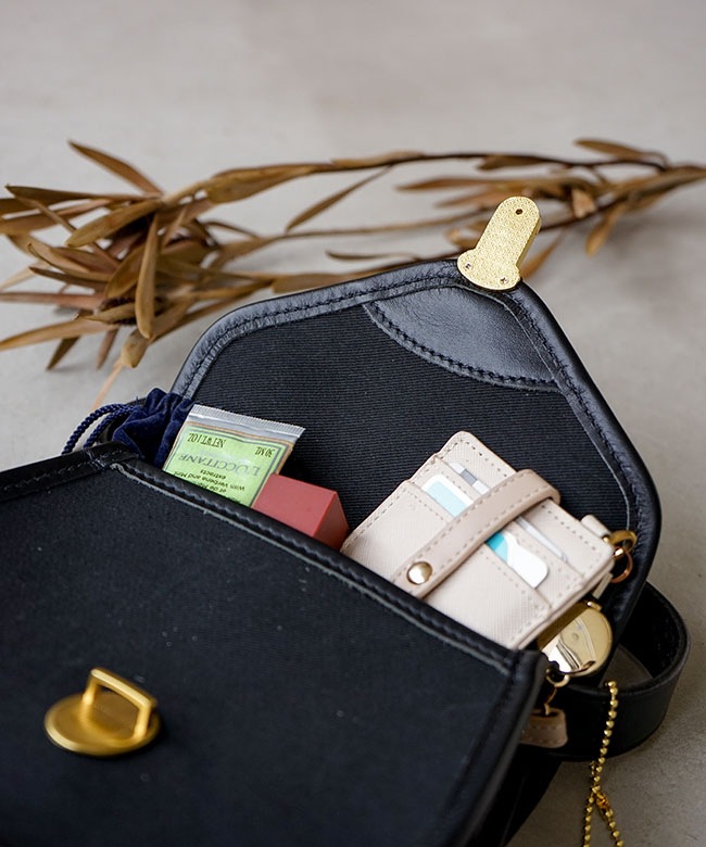 ・二つ折り財布やスマートフォンなどの小物だけを持ち歩く方にぴったりなサイズ感になっております。