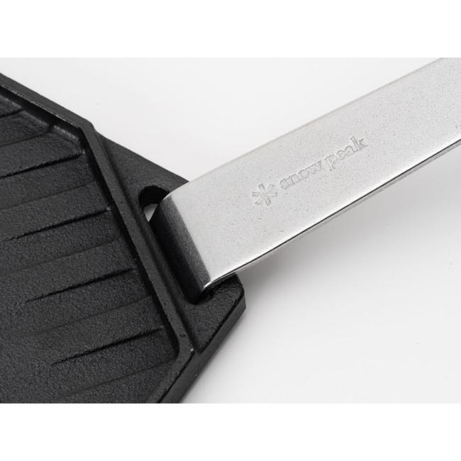 また、対角線上に山なり形状になっており、食材から出てくる余分な油分をグリドルの端に流す働きがあります。付属のステンレス製ハンドルを対角線上にある穴に差し込み持ち上げることができます。