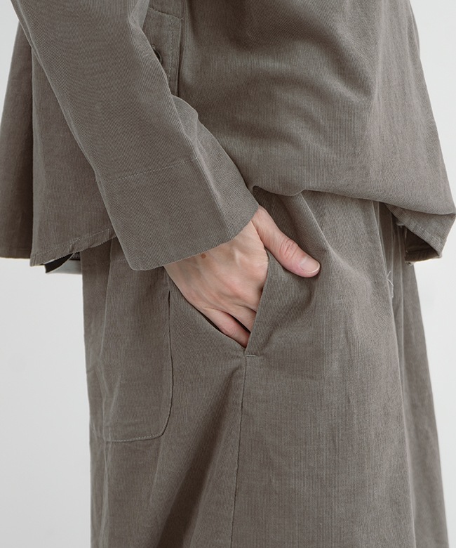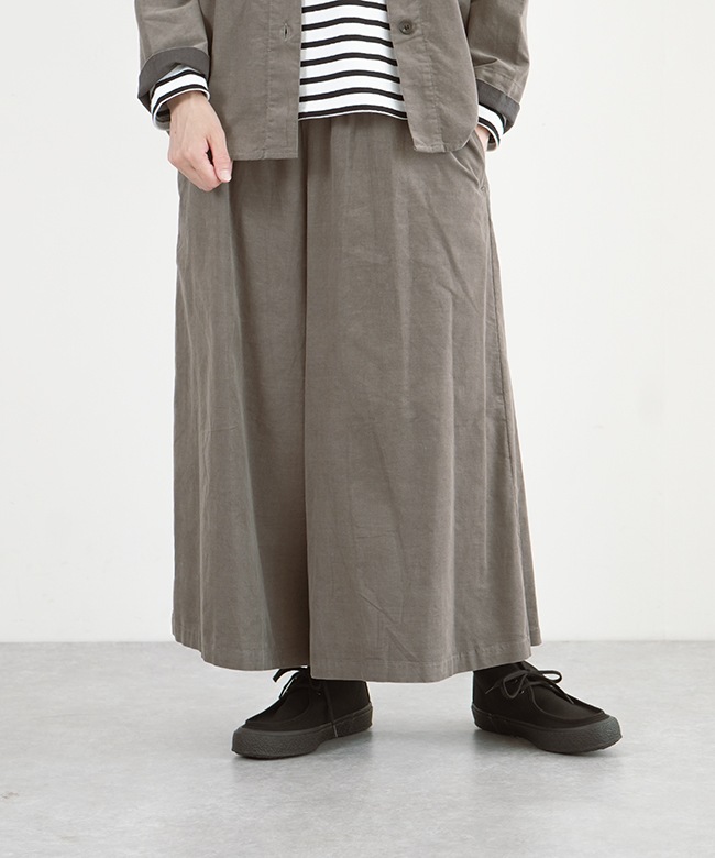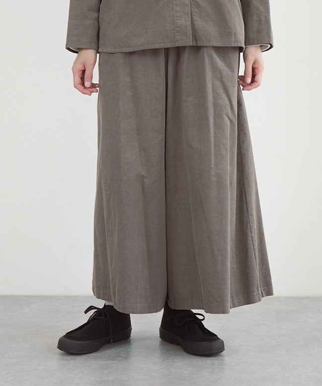 ・細畝が上品な光沢を生み、優しい肌触りのコーデュロイ素材のガウチョパンツ。