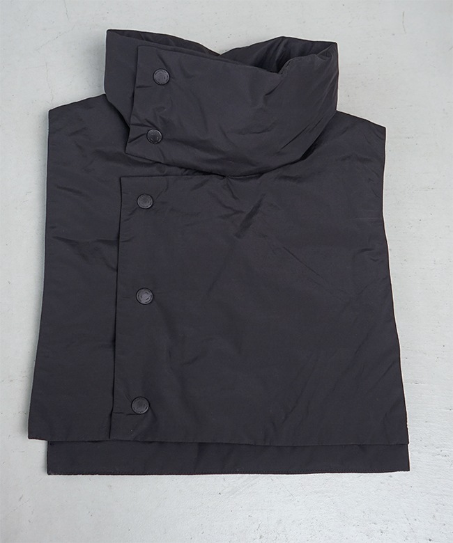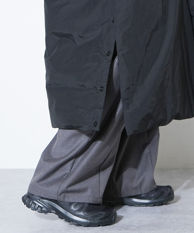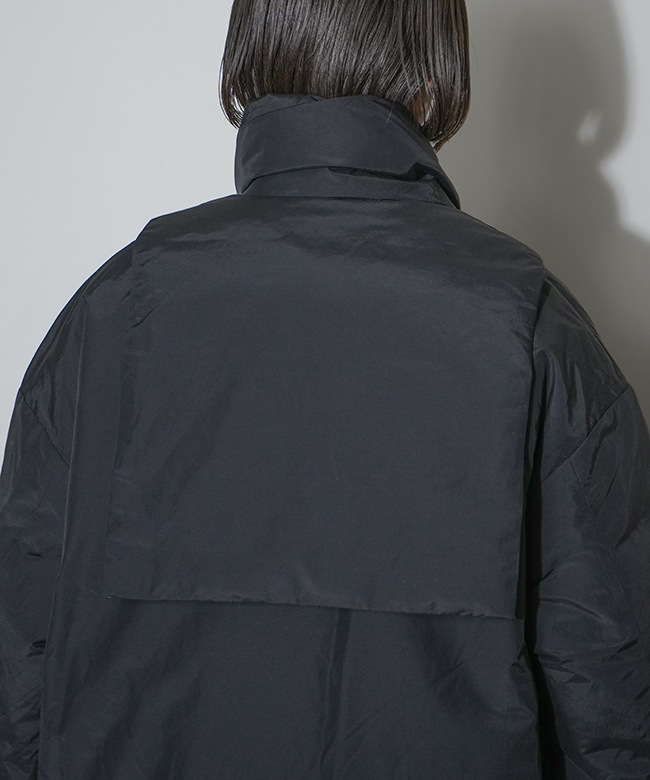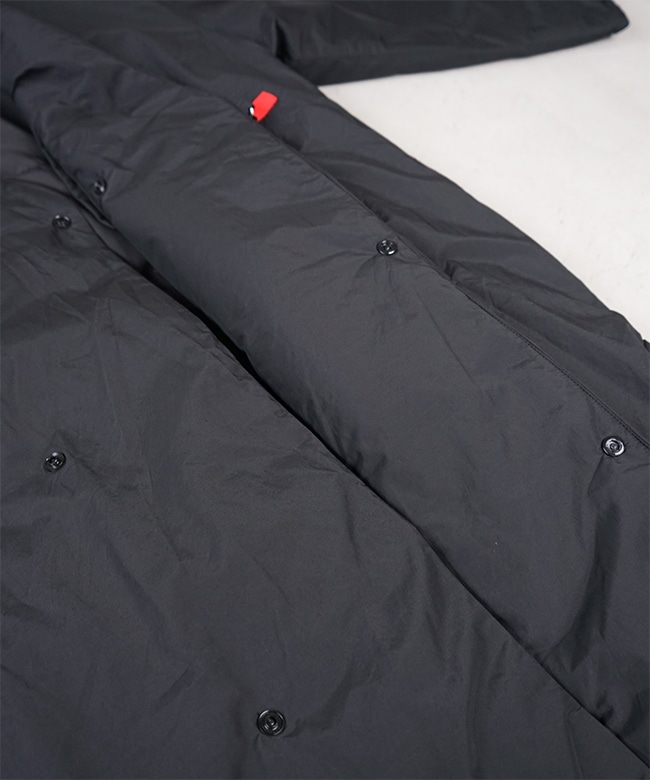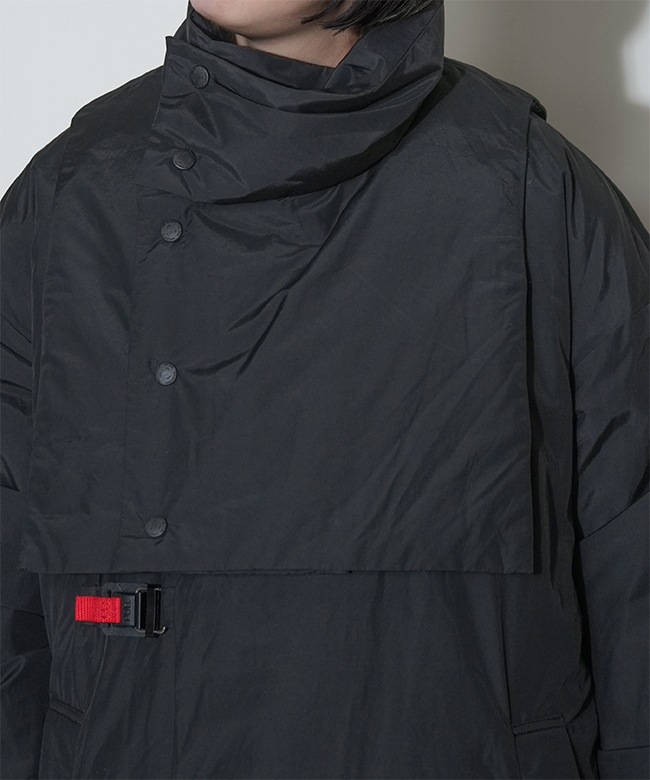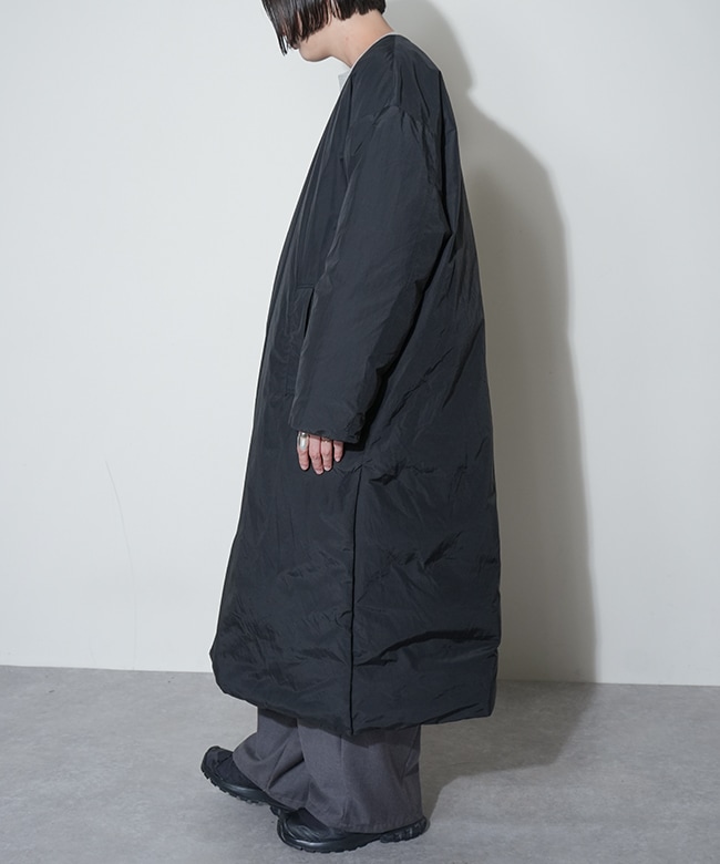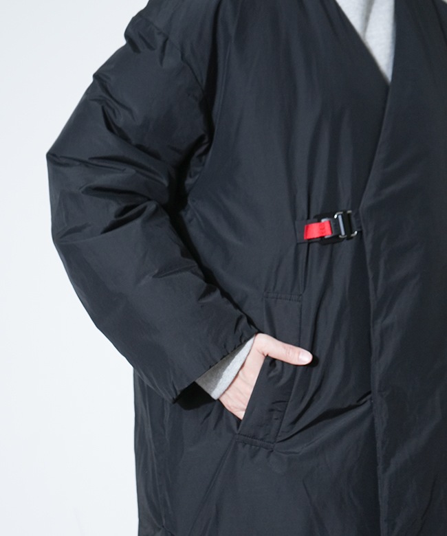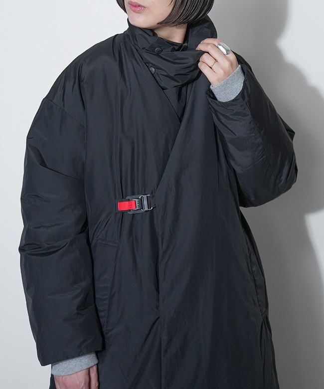 素材はリサイクルナイロンを使用した、Vカラーとスタンドカラーので着用可能な2WAYロングコート。