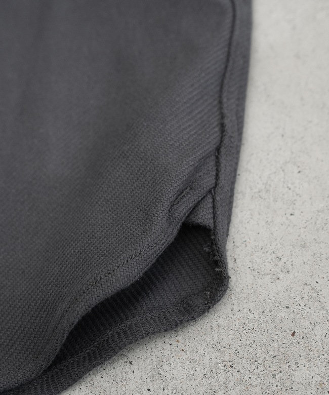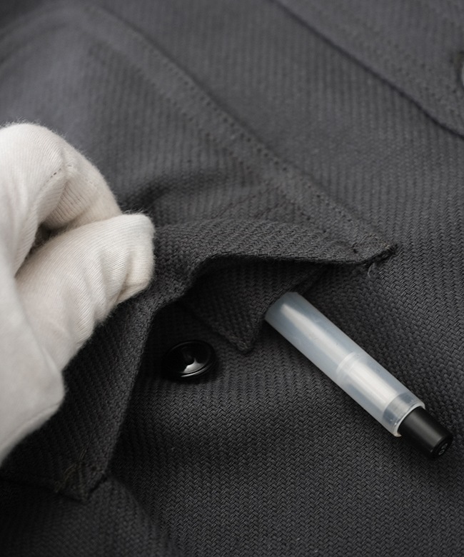 正面に付けられたボタンスルーのパッチポケットの他、身頃脇に非常に手間のかかるステッチを跨ぐ形で片玉縁ポケットを配置した当ブランドならではの多ポケット仕様。