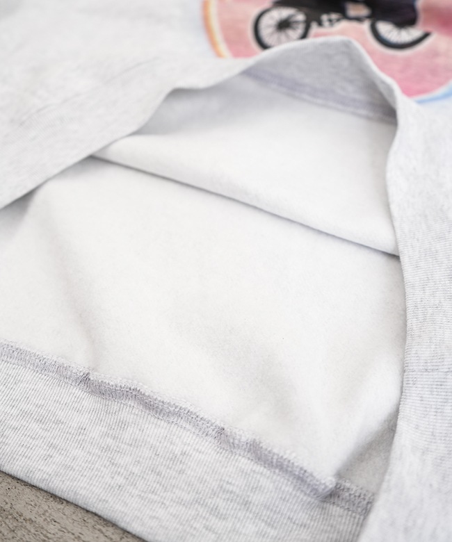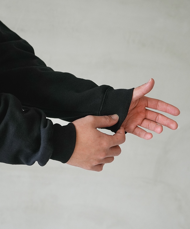 ・綿とポリエステルをブレンドした約9ozのミドルウェイトスウェットは柔らかさと適度なハリがあり、心地よい着用感です。