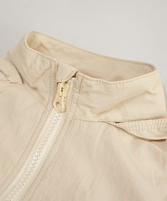 急な天候の変化でも安心のフードがしまえるウィンドブレーカー。