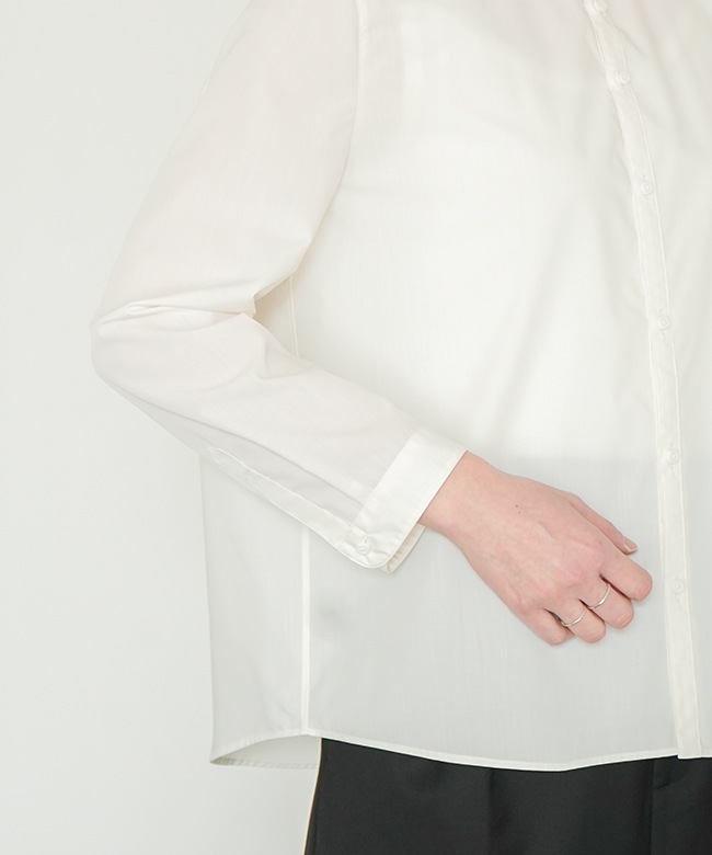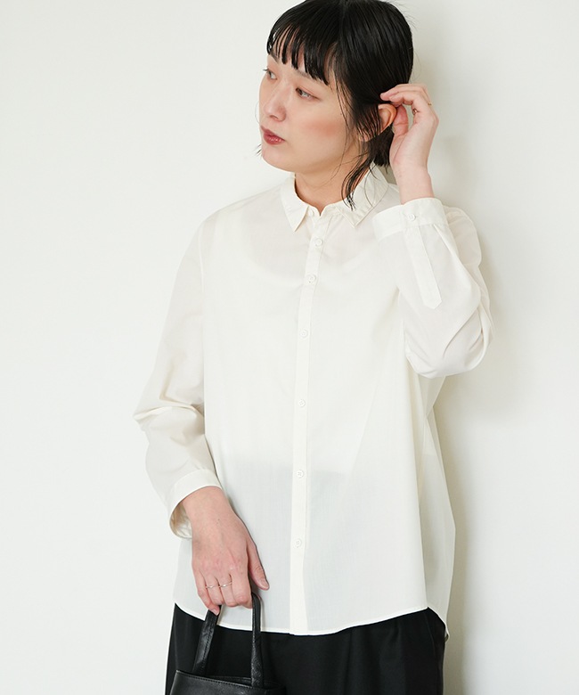 程よくゆったりした身幅で、9分袖くらいの袖丈です。
