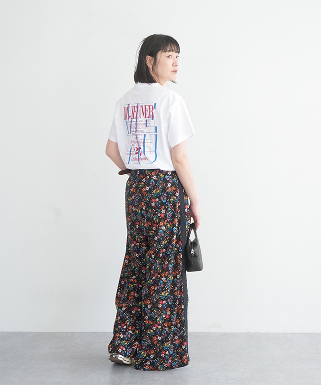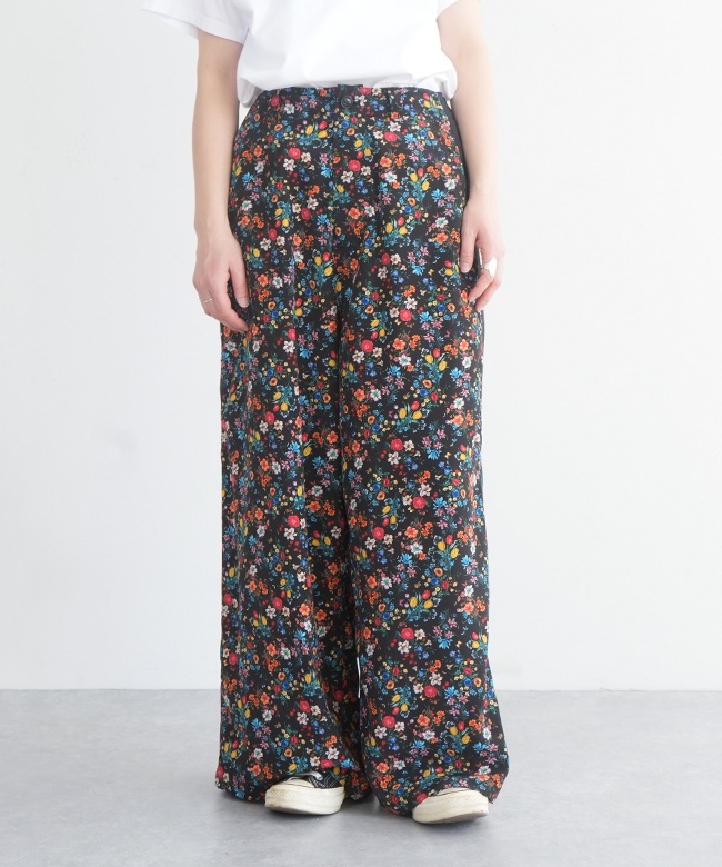 ・可愛くなりすぎずに着られるフラワープリントのワイドパンツ。