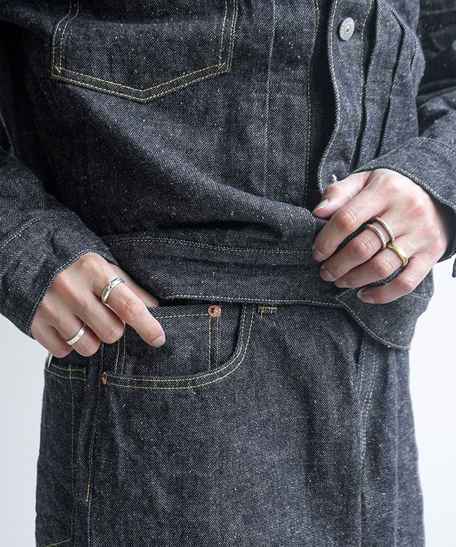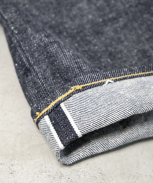 ・タテ糸7番×ヨコ糸9番の糸をシャトル織機で織り上げた14ozのセルビッジデニムは、落ちワタならではのムラ感やネップがあり、スビン綿ならではの滑りや肌触りも楽しめる優れた素材。