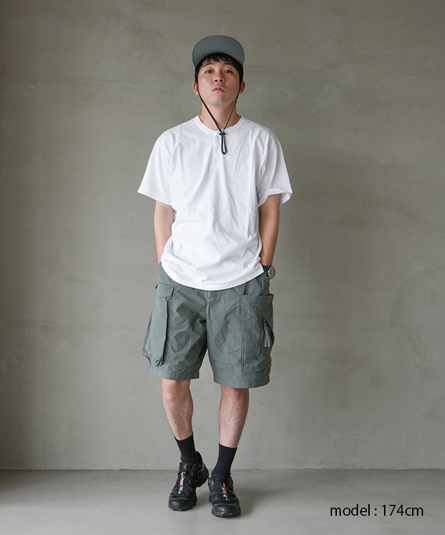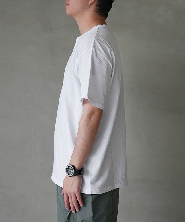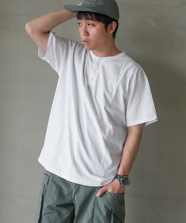 ラフでありながら落ち着いた印象に仕上げたヘンリーネックTシャツ。