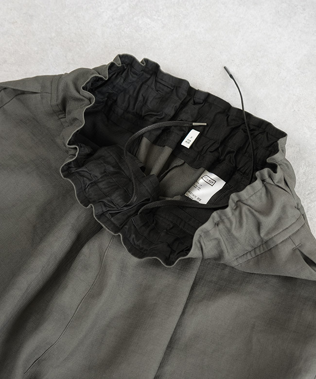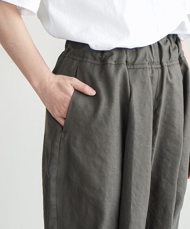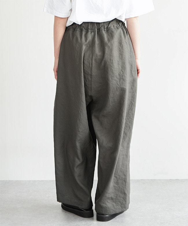 ・ウエストは太めのゴム仕様に加え、紐付きで穿き心地は楽ちん。タックインした際に見えるウエストゴムのギャザーがさりげないアクセントに。