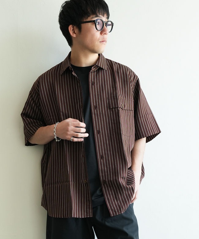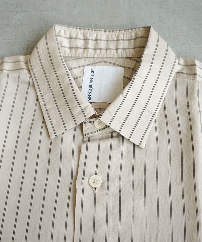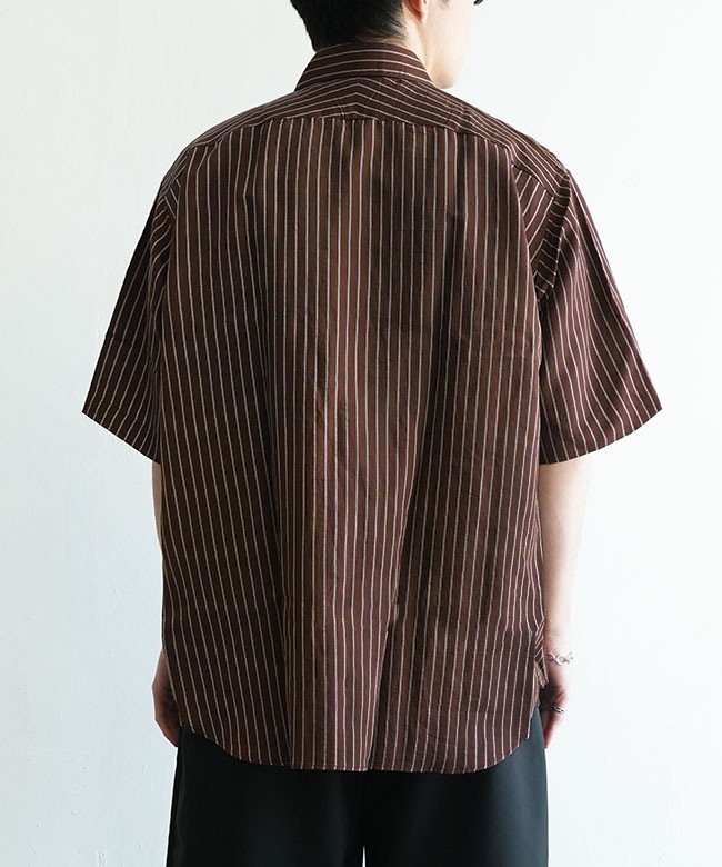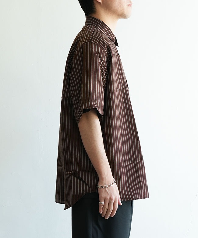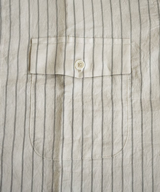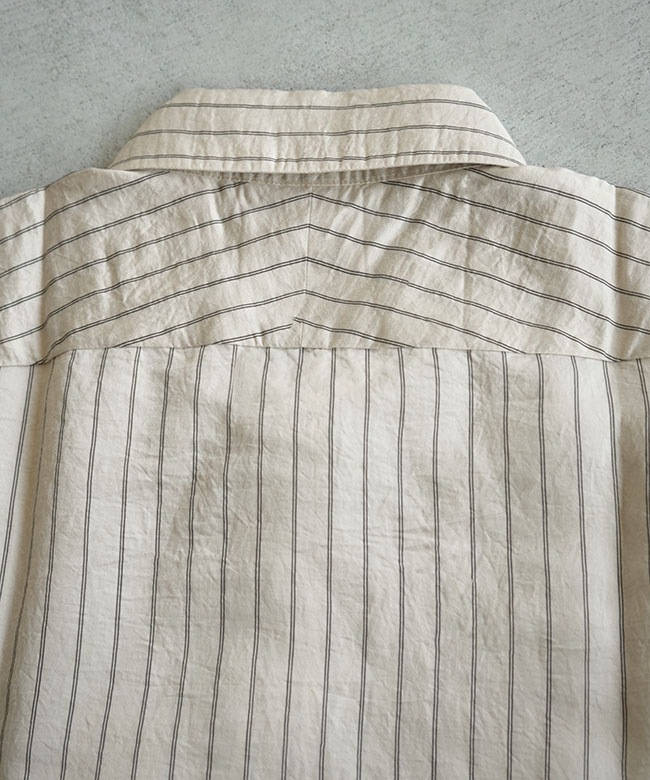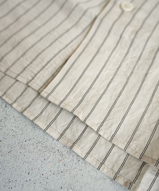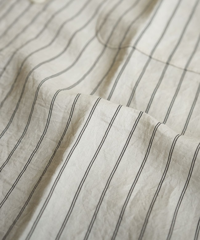 ・自然素材を原料としたセルロース生地とポリエステルの交織で作られたストライプシャツ。