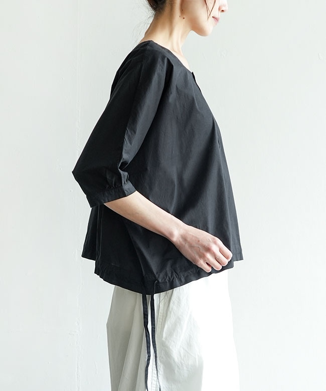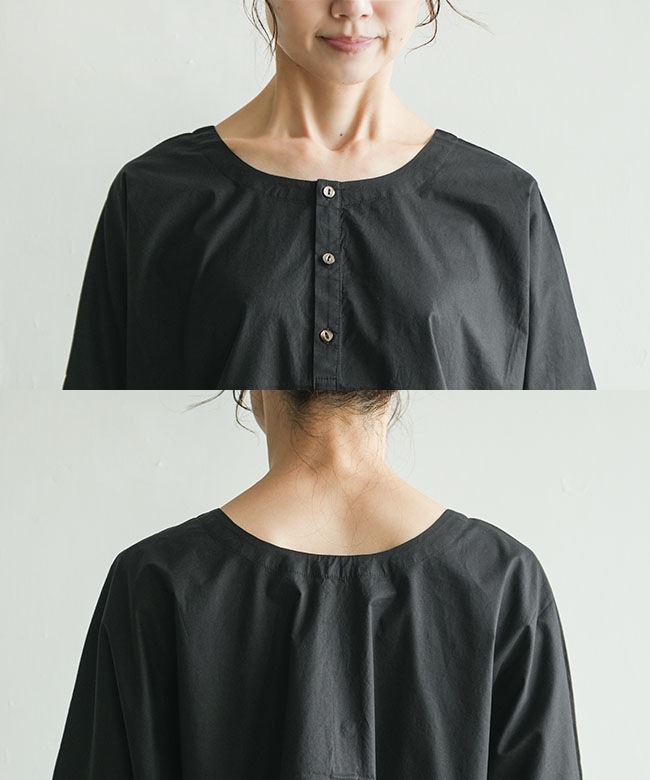 ・フロントが寂しくなるときはボタン面を前に、アクセサリーを楽しみたいときは装飾のない面を前に。ボタンを開けるとキーネックのようにも着こなせます。