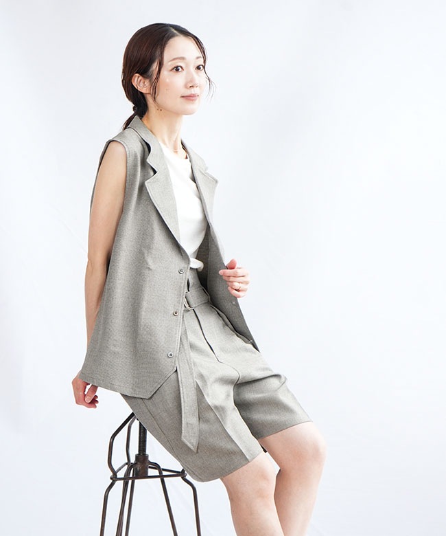 ・同素材のテーラードジレとのセットアップコーデもおすすめです。