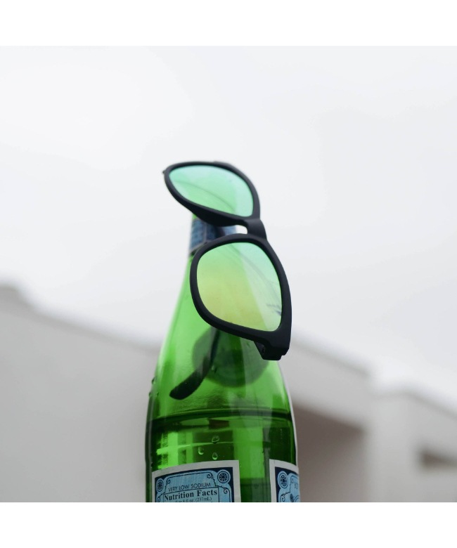 ブラックのフレームにグリーンのミラーレンズ。緑の色味が今っぽいおしゃれ感