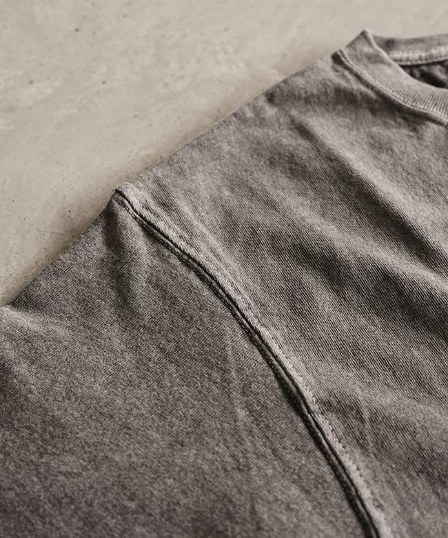・擦れた色合いが特徴的なピグメント染め(顔料染め)のTシャツは、風合い感とステッチ部分のアタリが古着のような雰囲気演出。