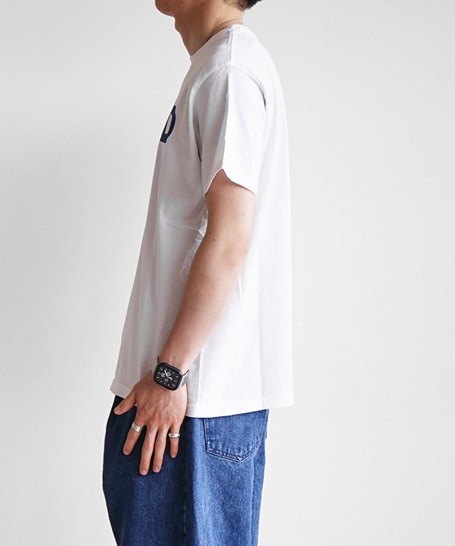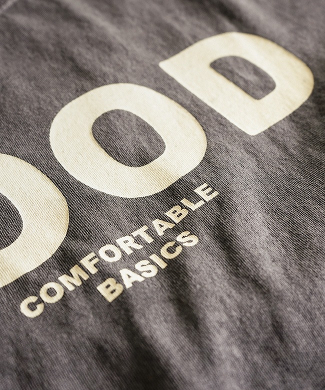 ・しっかりとした着応えのある生地感と製品染めの風合いのある色がシンプルなプリントをさらに引き立たせています。
