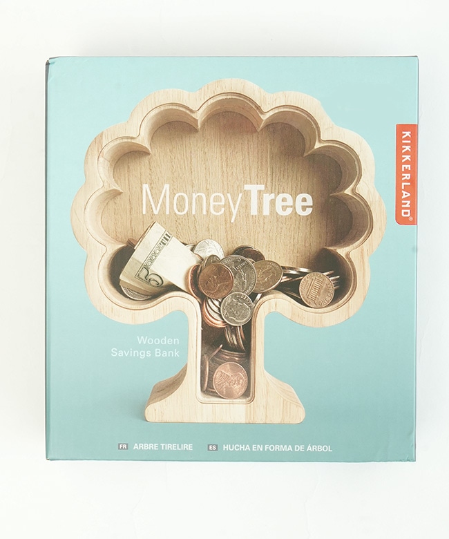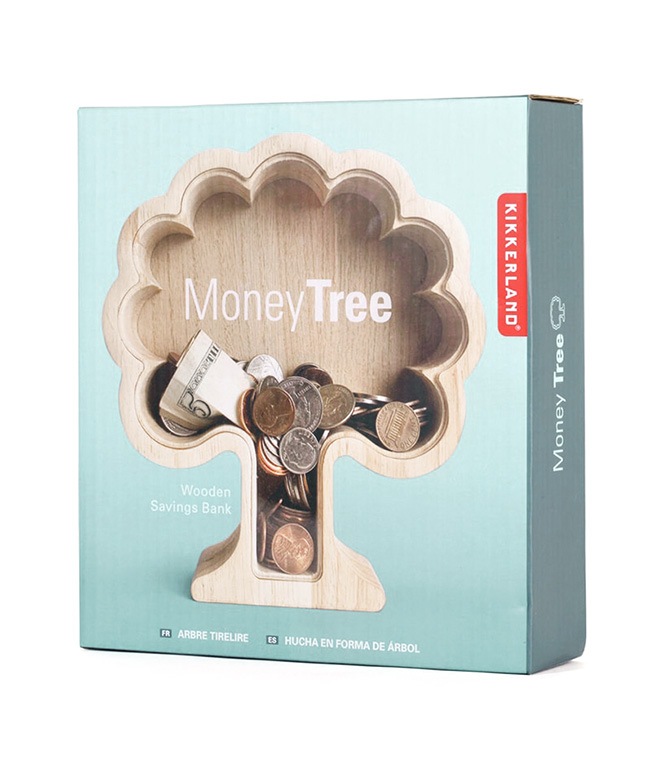 ニューヨーク発の人気ブランド「KIKKERLAND」から届いた、ユニークでインテリア性の高い木製のコインバンク「マネーツリーバンク」。
