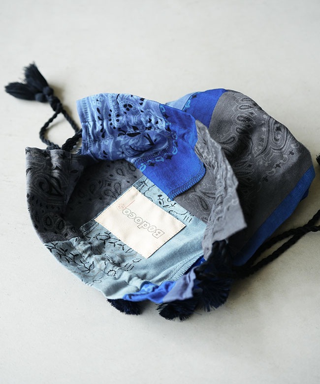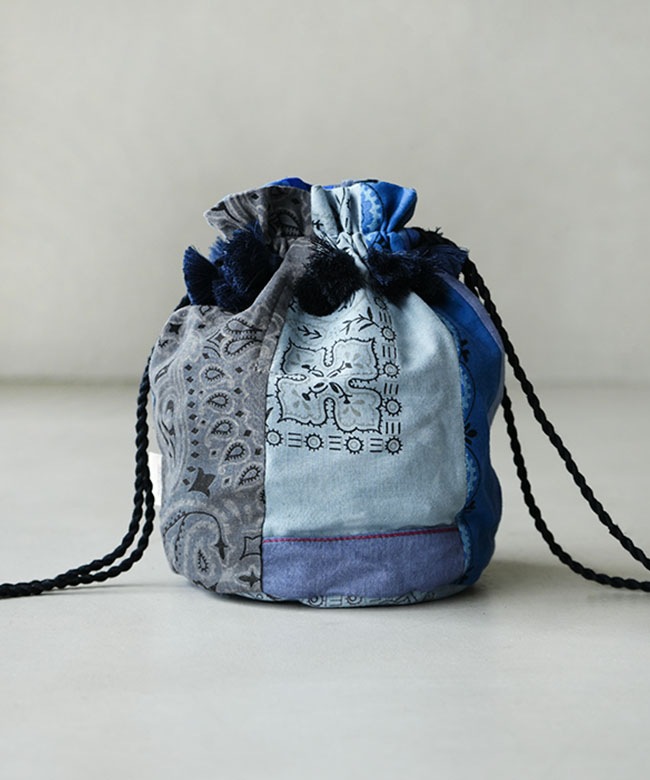 ・輸入古着を資材として制作された巾着型のバンダナポーチ。