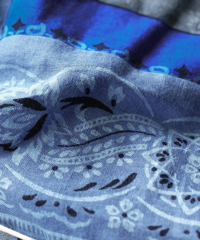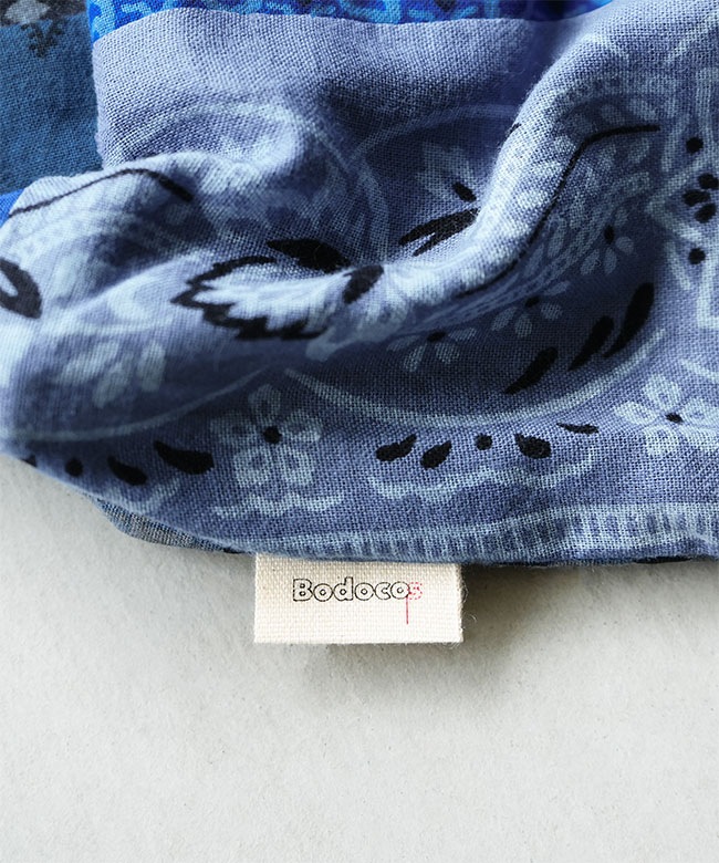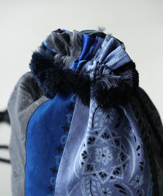 ・バンダナ柄のレトロなペイズリーを生かしつつ、巾着タイプで使いやすくなっています。