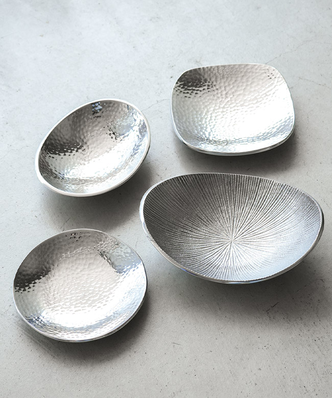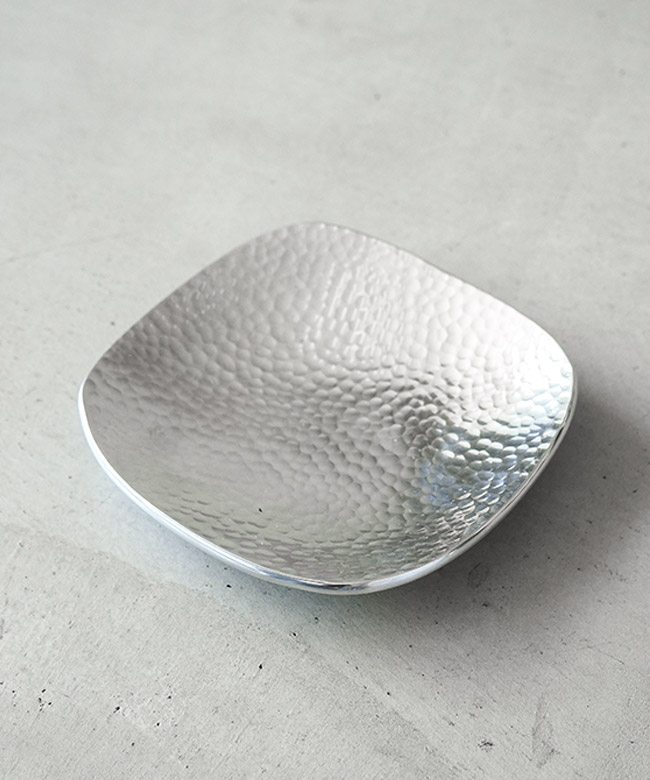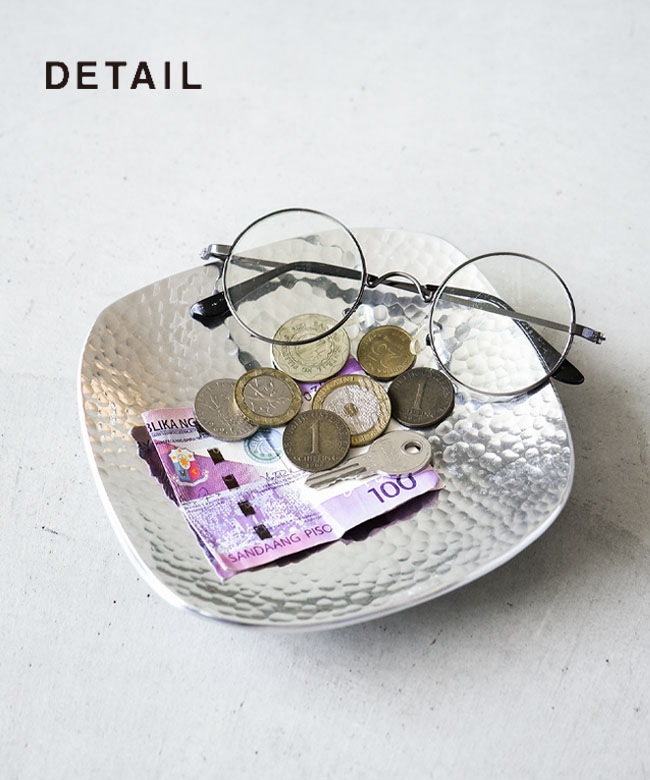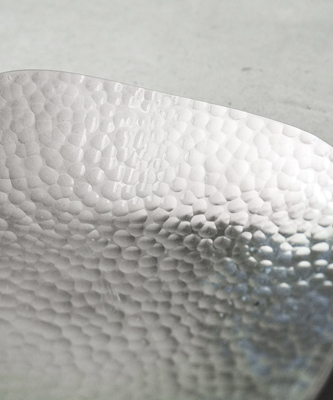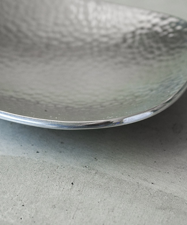 ・職人の技術が光るハンマートーン加工が施されており、トレイの表面には特徴的な凹凸が生まれ、光の当たる角度によって多様な表情を見せてくれます。