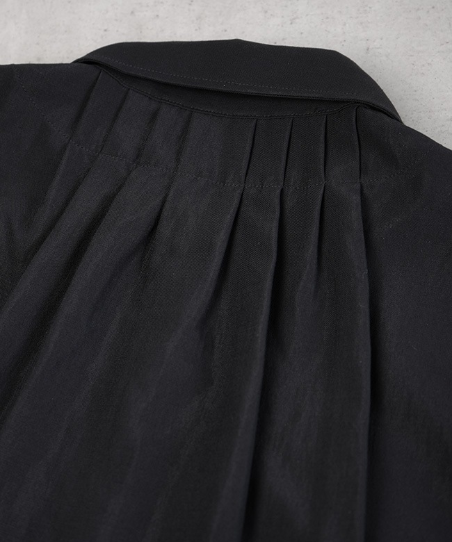 ・後ろ裾は長めに取りながらも底のラインを直線にすることですっきりと見せ、前を開けて羽織るように着ても雰囲気の良い着こなしに仕上がります。