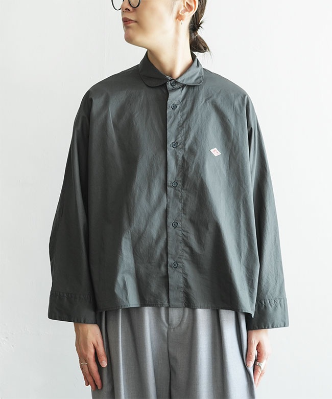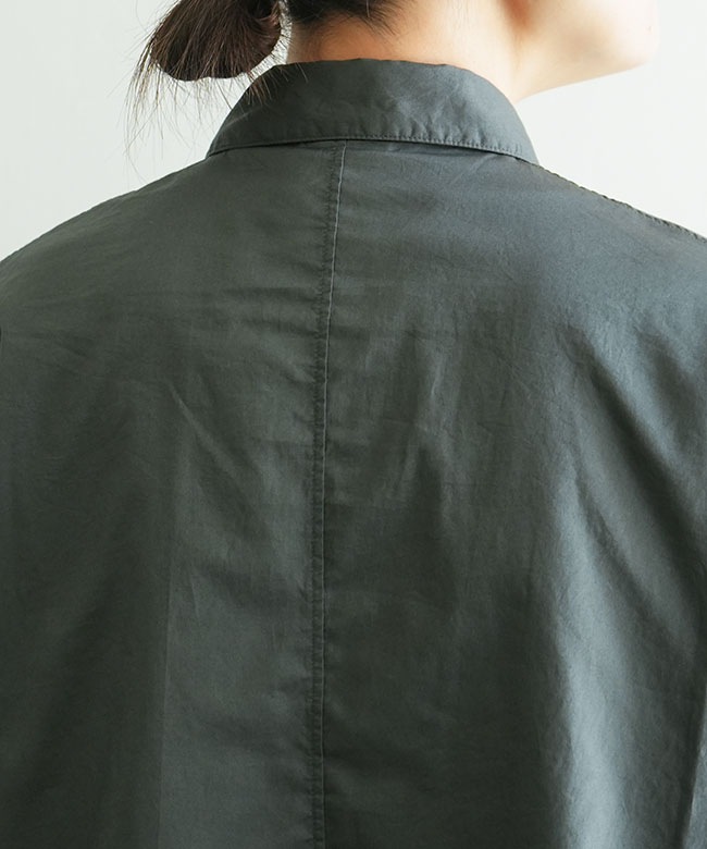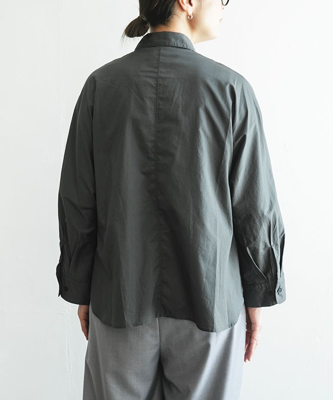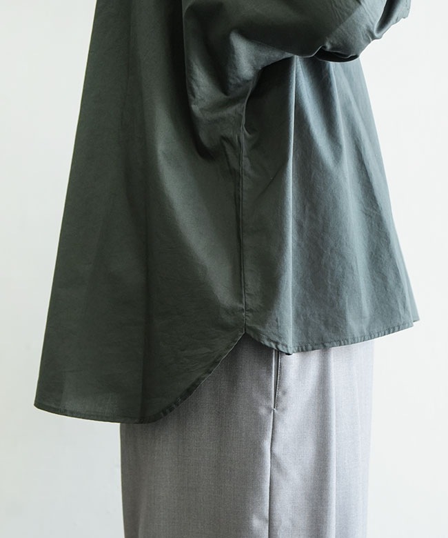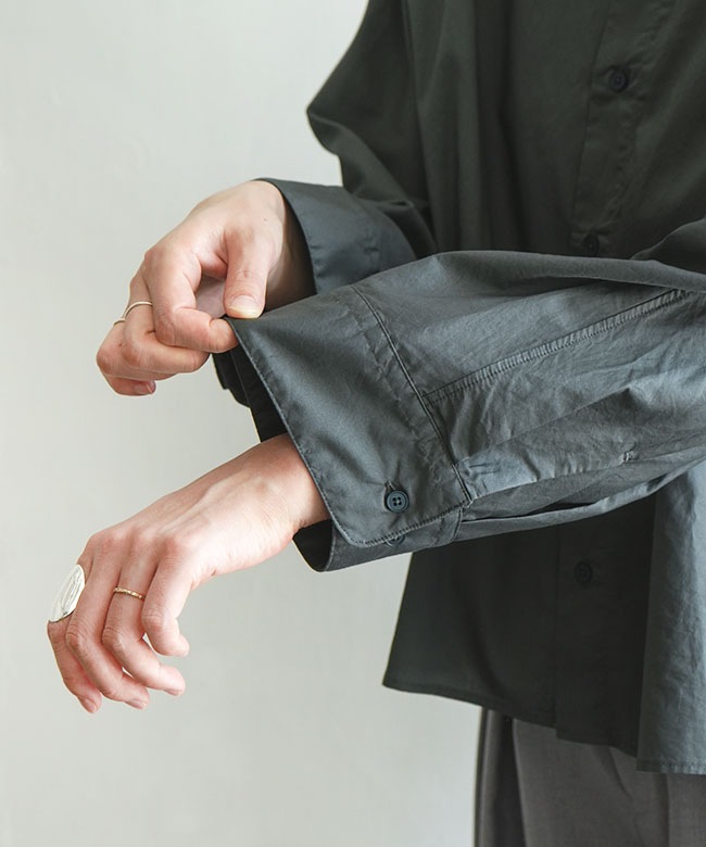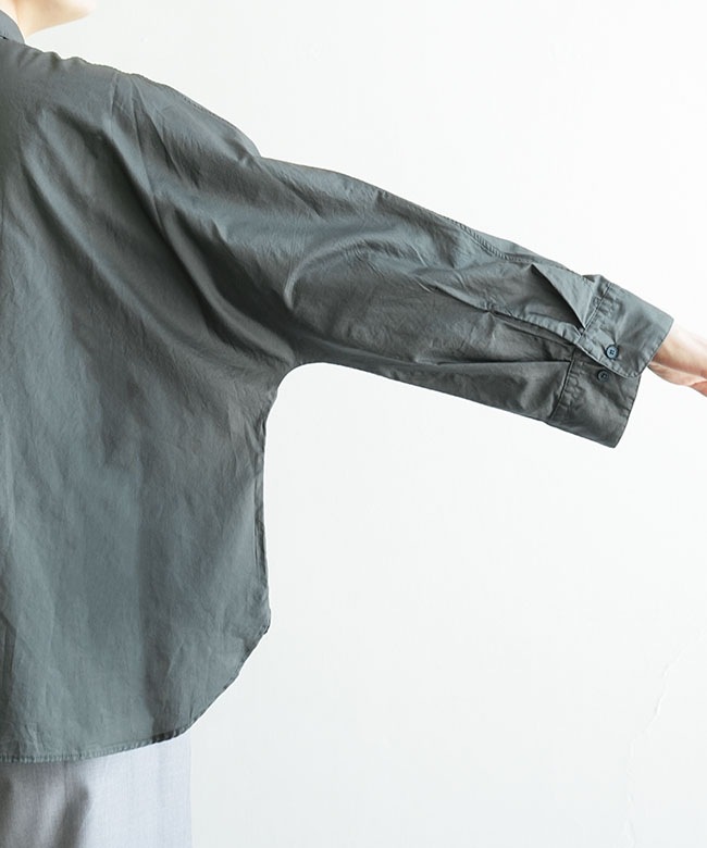 ・一見ベーシックなシャツですが、ドルマンスリーブや前後差のあるラウンドヘムなどユニークなディティールが詰まっています。