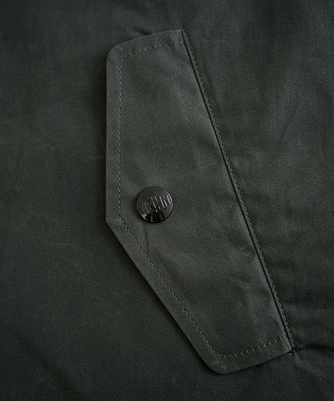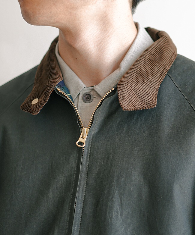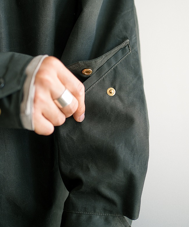 ・表地はコットンに特殊なコーティングを施し、オイルドクロスのような風合いを表現。着用を繰り返すほどにアタリが生まれるエイジングをお楽しみいただけます。
