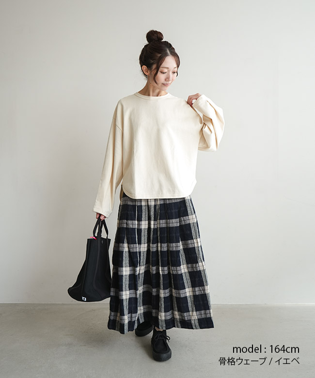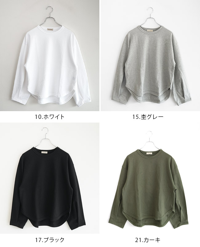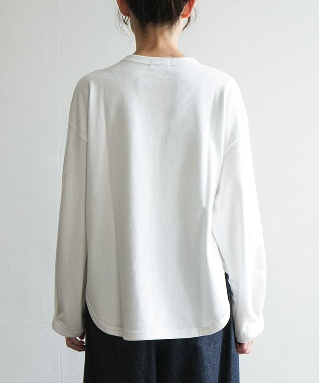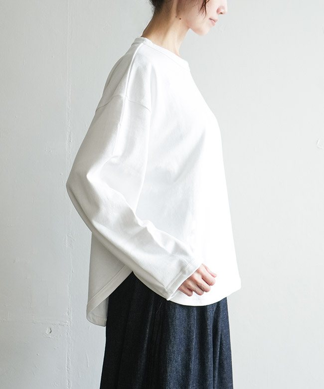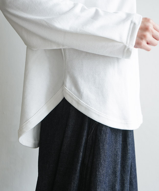 ・裾を前後差を付けた丸みのあるラウンドヘムにすることで、裾を出した着こなしもこなれ感のある柔らかな印象に。タックアウトが苦手な方でも一枚で映えるシルエットに仕上がっています。