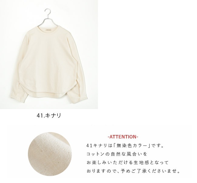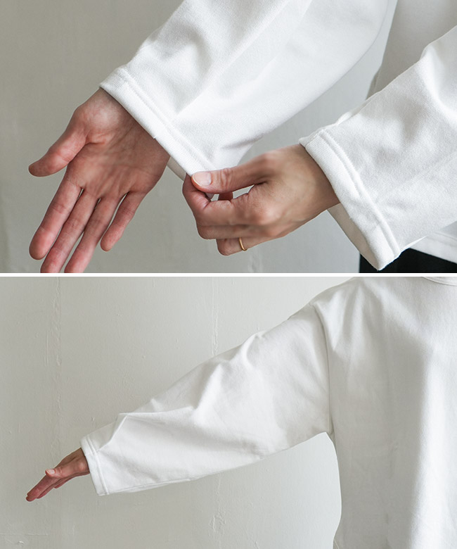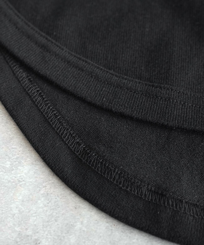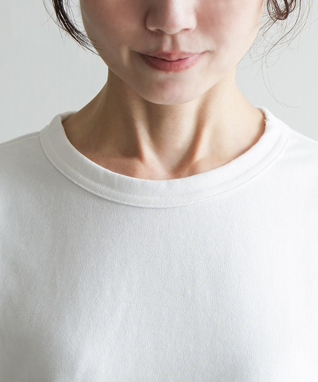 ・首元はバインダーネックを採用することで、着用やお洗濯の繰り返しによるヨレや伸びを軽減し、長く愛用していただけるようにしております。