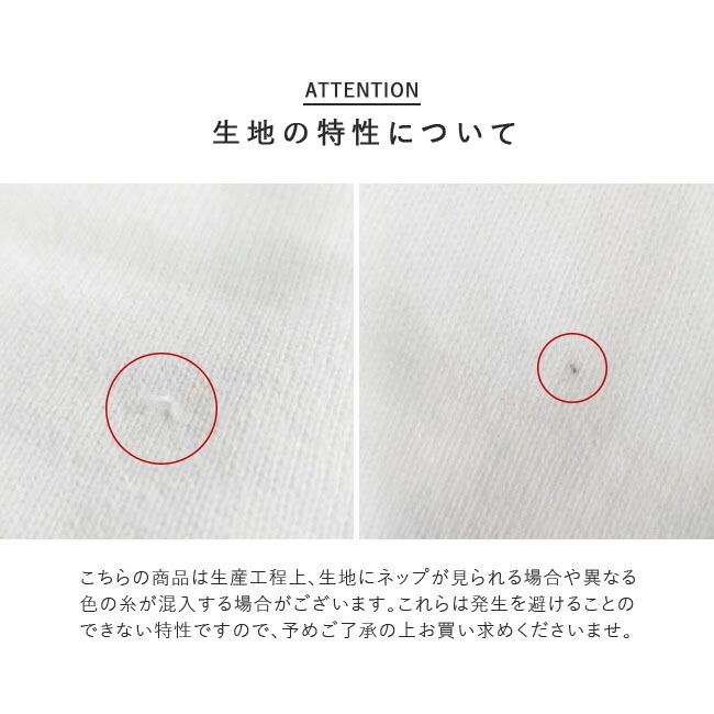・こちらの商品は生産工程上、生地にネップが見られる場合や異なる色の糸が混入する場合がございます。これらは発生を避けることのできない特性ですので、予めご了承の上お買い求めくださいませ。