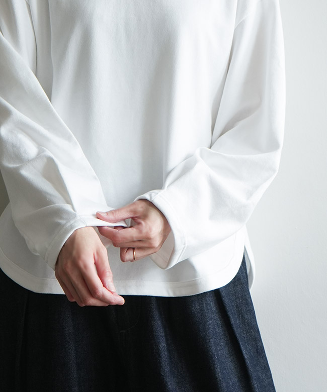 SOLAMONATで大人気のペンネ天竺シリーズより、袖のタックデザインがポイントになったベーシックなプルオーバーが登場。