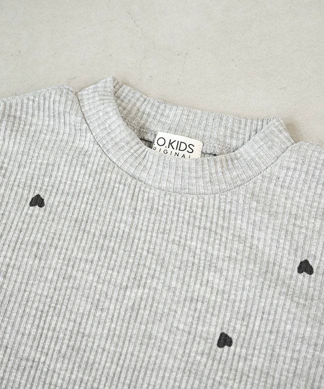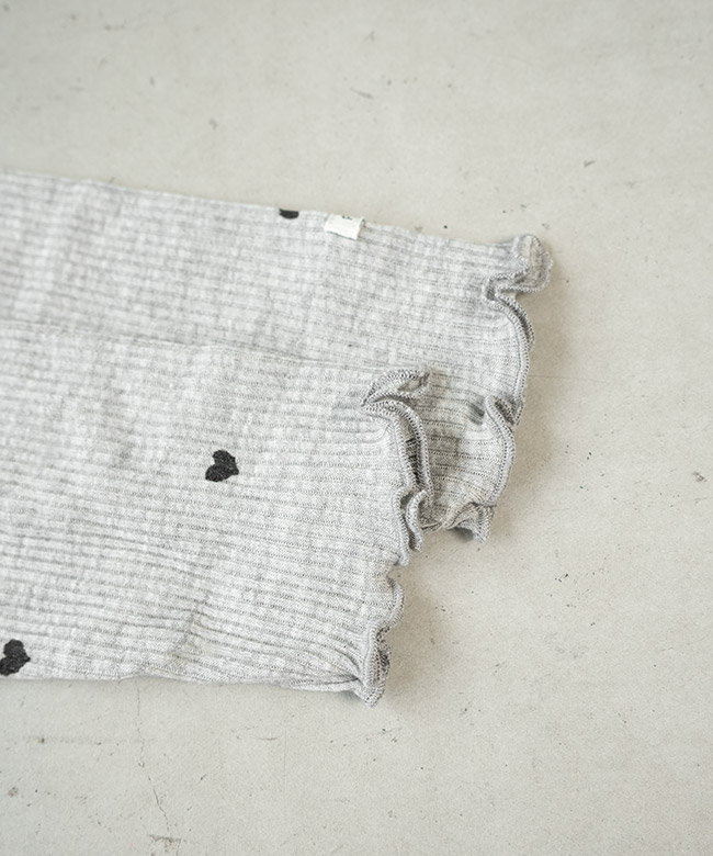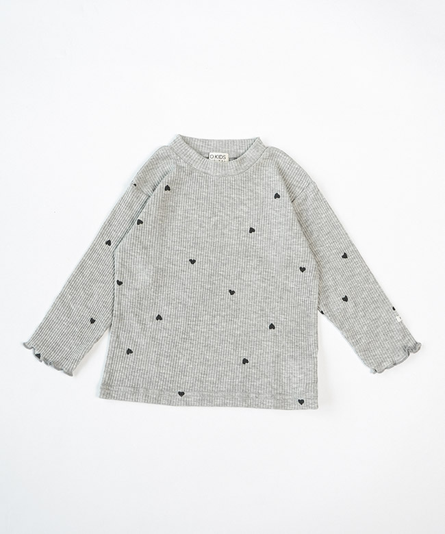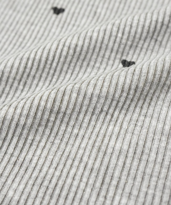 ・リブTシャツは伸縮性のある薄手の生地に、小さなハートが全面に散りばめられたデザイン。