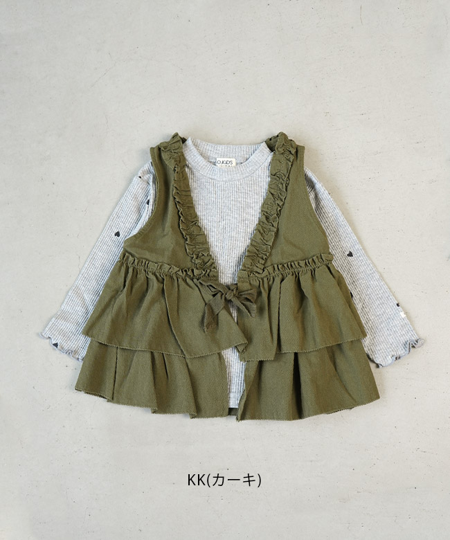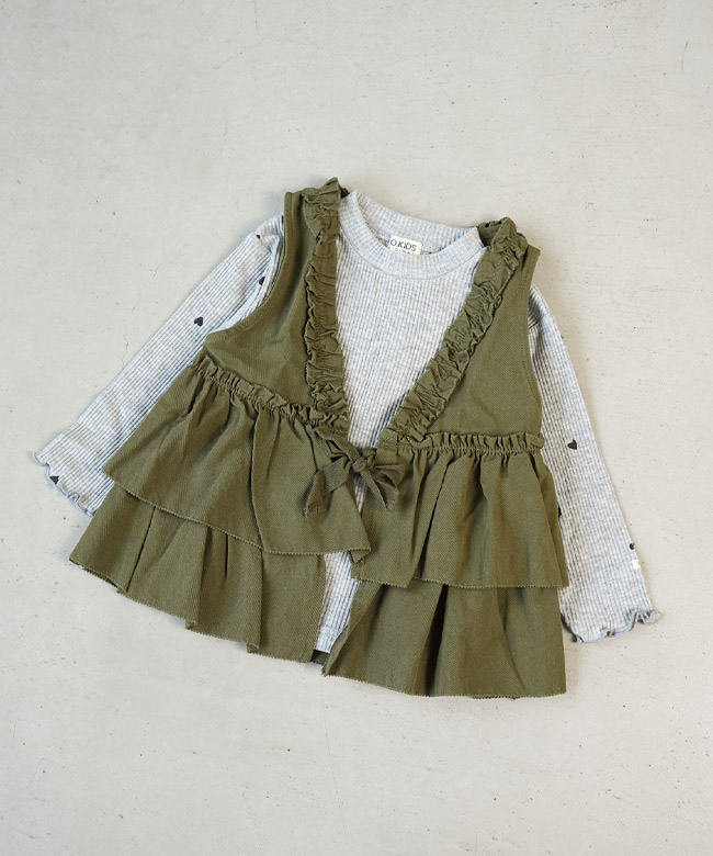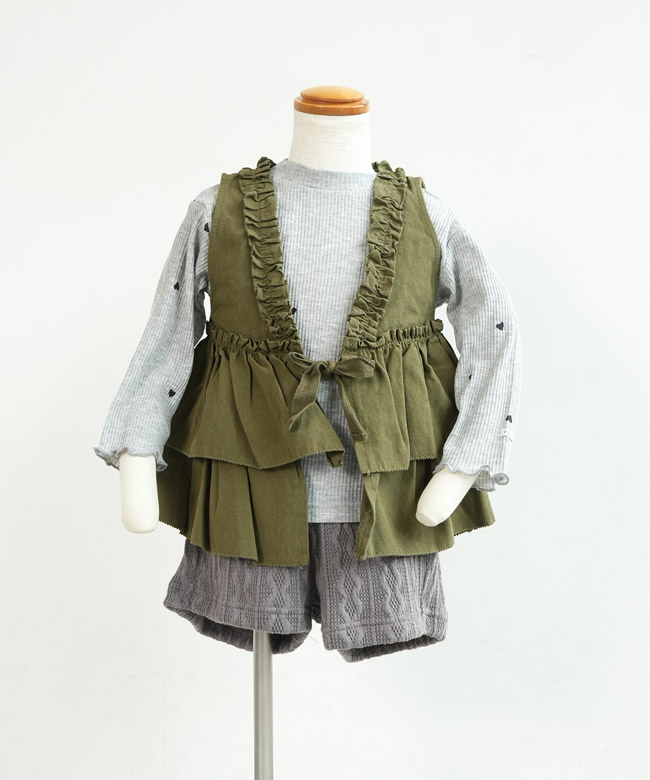 ・ハートが散りばめられたリブTシャツと、フリル使いが可愛いベストのセットアイテム。