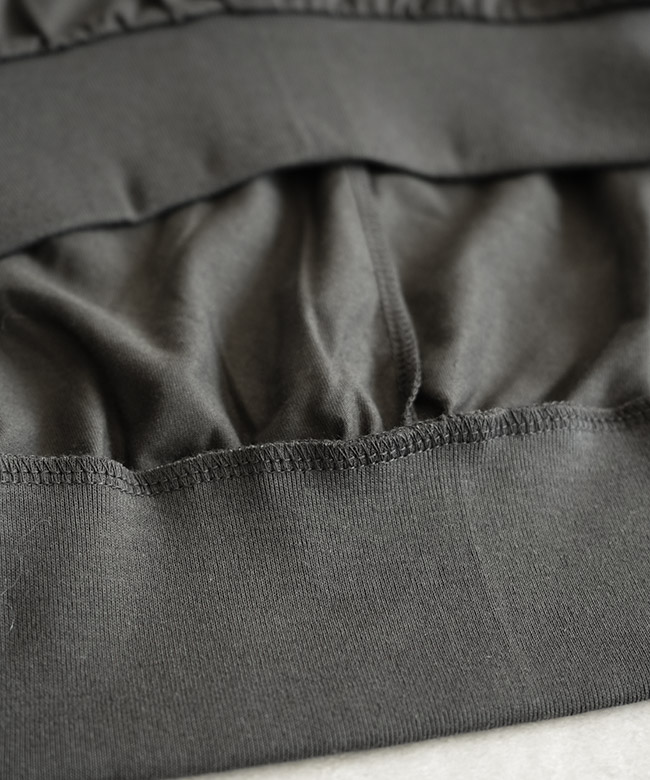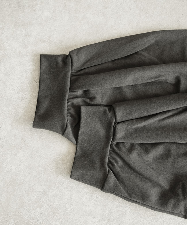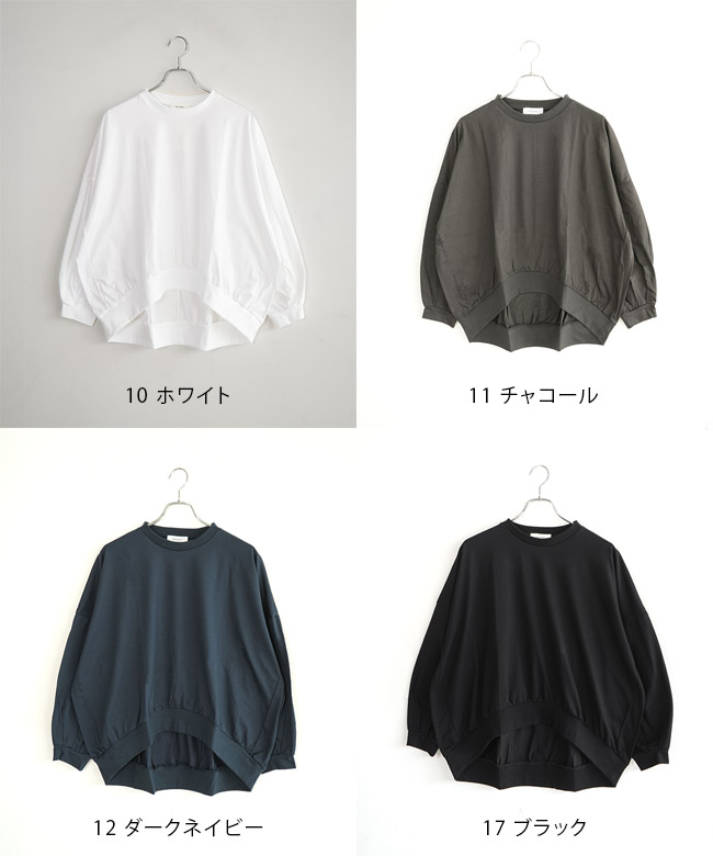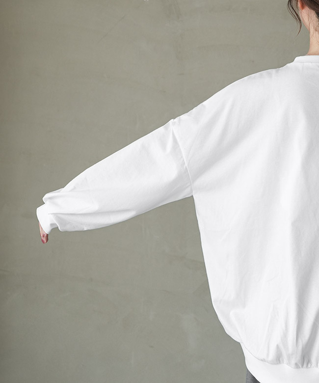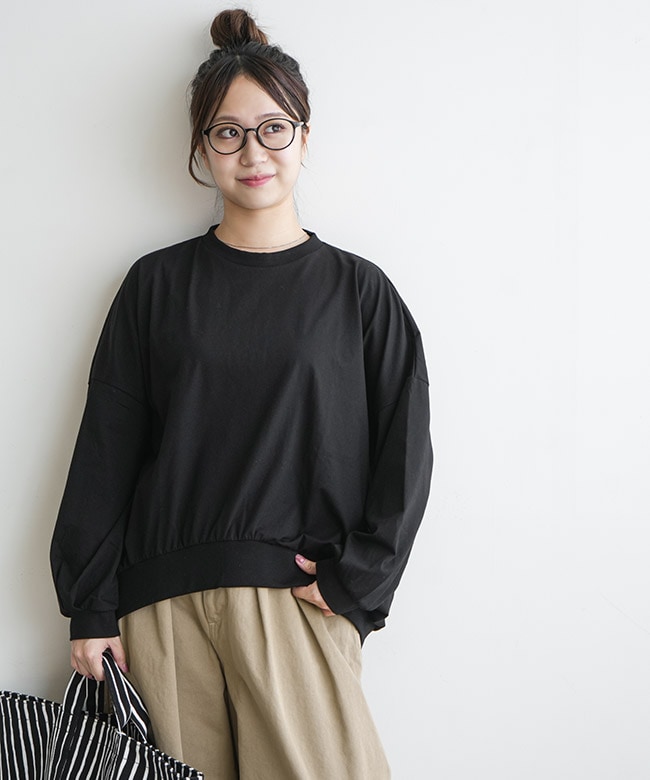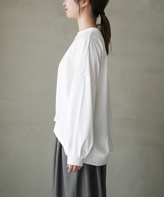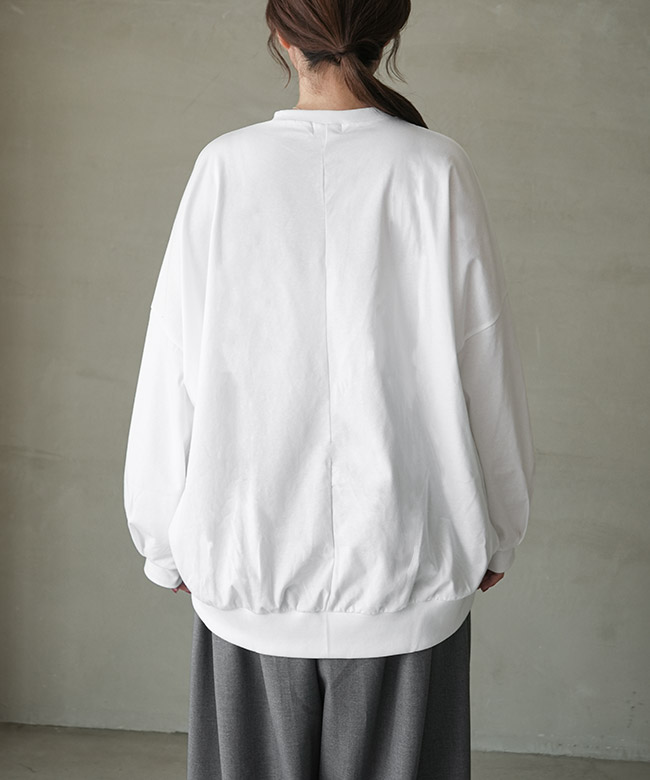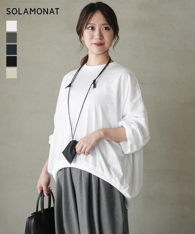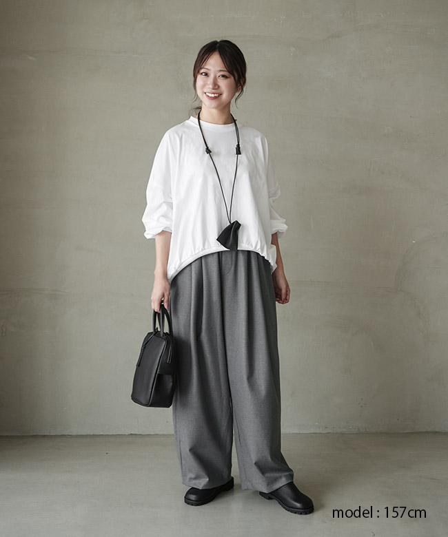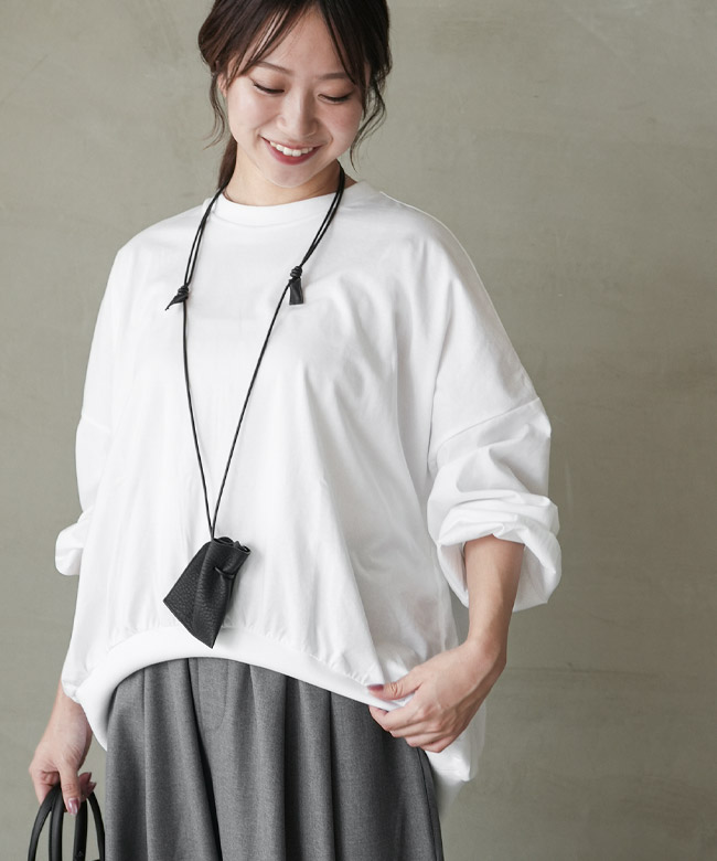 ・裾のリブと細かなギャザーから作られるコクーンシルエットがポイント。裾がたぷっと溜まることで立体的な形を描き、シンプルなTシャツコーデのマンネリを解消します。