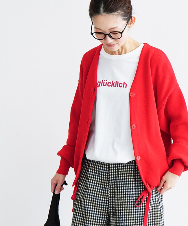 ・前開きのVネックデザインは、羽織りとしてもトップスとしても使える万能仕様。シンプルなカットソーやシャツの上からさらりと重ねてもサマになります。