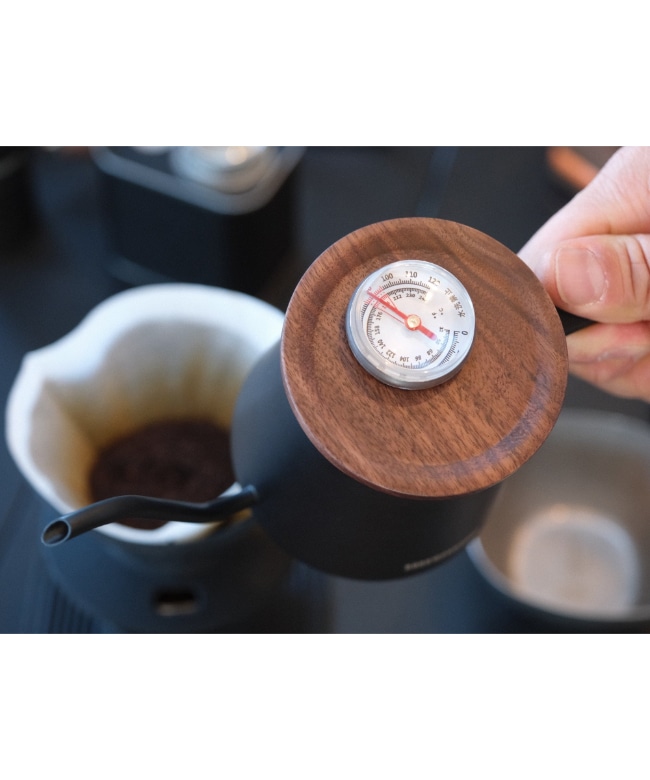 温度計付きのドリップポッド。蓋部分にブラックウォルナットを採用。