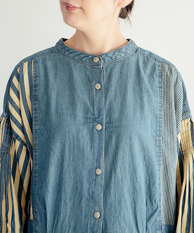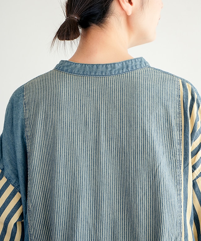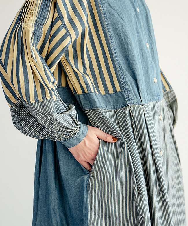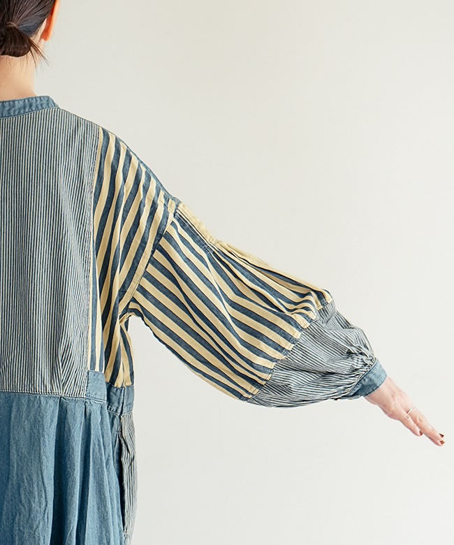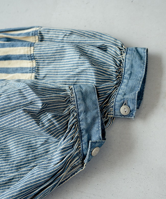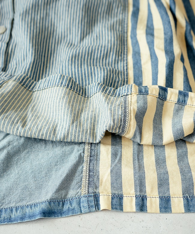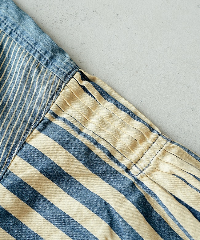 程よいハリ感のあるコットンデニム×ヒッコリーストライプ生地3種類を使用。